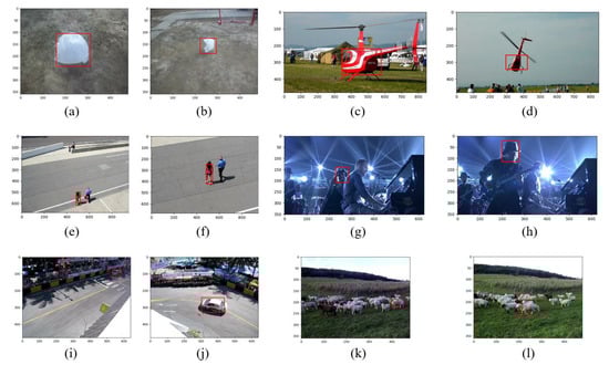 Screenshots of the tracking result from the proposed algorithm from VOT2018 dataset: bag (a,b), helicopter (c,d), crossing (e,f), shaking (g,h), racing (i,j), and sheep (k,l).