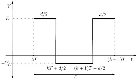 Equation (8) is solved to obtain the duty cycle at each sampling time, which ensures the condition of zero average dynamics when applied to the system through switch S. The duty cycle was obtained in refs. [8,22] and can be expressed by Equation (9):