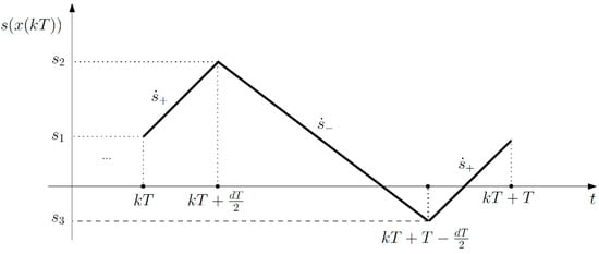 The ZAD approach was proposed in ref. [22] and studied also in refs. [19,23,24]. The idea behind the method is to define a sliding error function and force the average error to zero at each sampling period [23]. Then, suppose that is the tracking error and is the sliding surface; thus, it can be represented as a piecewise linear function of the state as given by Equation (6):