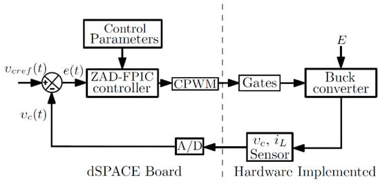 Figure 5 shows the block diagram of the implementation and control of the system with ZAD-FPIC. The blocks on the left side are implemented using dsPACE technology (Paderborn, Germany), in particular, the digital implementation of proposed control strategy is developed in the DS1104 board, while the blocks on the right side include the system hardware. The digital part implemented in the DS1104 board performs the following tasks: acquires signals; converts them from analog to digital; executes the control strategy at each iteration; calculates the duty cycle and generates CPWM signals. The output signal is sent to the opto-coupling circuit, which enables/disables the MOSFET power transistor, to finally feed the Buck Converter. The output signals of the circuit are measured and conditioned by a proper circuit.