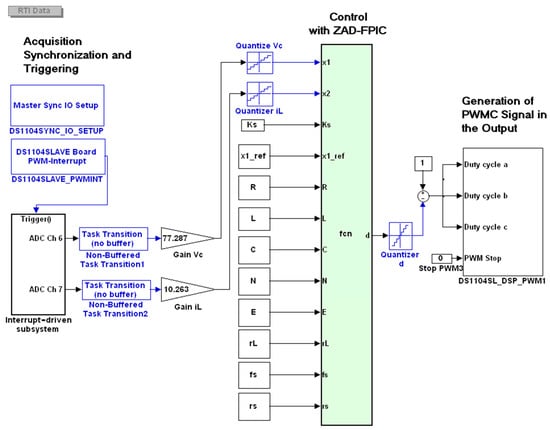 For implementation of the ZAD-FPIC control technique, it is necessary to know some values of constant parameters such as , , , , , , , , , and . In addition, the values of voltage in the capacitor () and current in the inductor () are also considered for sampling. The values of the parameters are measured from the electrical circuit and placed in the respective inputs of Figure 10.