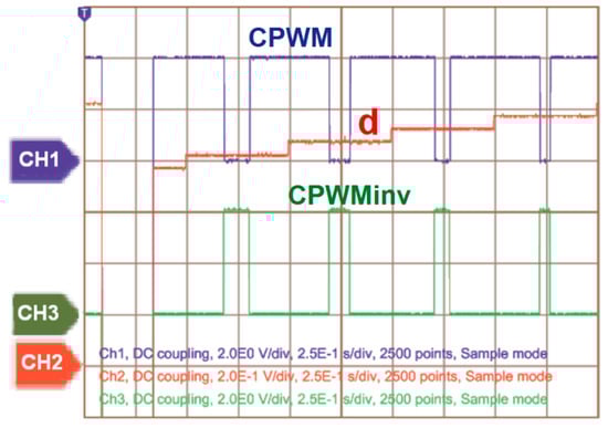 Using the configuration shown in the right part of Figure 10, the same duty cycle is entered into the three inputs of the CPWM generation block in order to have only one CPWM output and its inverted CPWM signal (CPWMinv). The outputs CPWM and CPWMinv have the following characteristics among many others: they are complementary, centered, of constant switching frequency in the range of 1.25 Hz to 5 MHz, they are signals of the TTL type, they are protected by a dead time (deadband), and their initiation mode and its stop time are controllable. Figure 11 shows that CH1 is the CPWM output, CH3 is the CPWMinv, and CH2 corresponds to the duty cycle and changes proportionally with time.