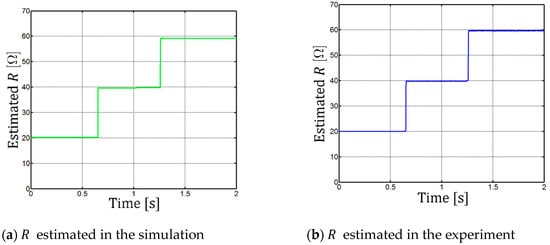 Implementing the estimator in the Simulink-MATLAB software, the total parasitic resistance was measured and expressed as in Figure 4a. Now, the total resistance in the inductor and current measurement is and the total resistance in the MOSFET and source is as shown in Figure 4b.