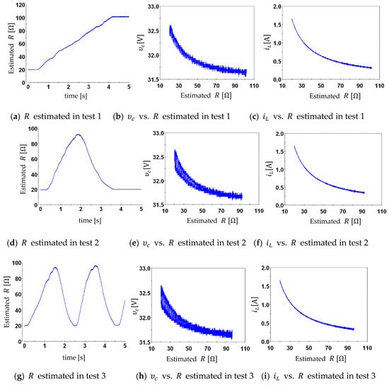 The internal parameters of an electronic converter may vary depending on the operating conditions. In addition, load variations or the aging of components may occur. Ignorance of these parameters in real time can cause inaccuracies in the design of the controllers [10], which causes instability throughout the system [11]. Therefore, adaptive and self-adjusting controllers based on parameter identification are being investigated. Power losses in the circuit must be considered to accurately represent similar results between simulation and experimental tests. In the literature, some authors have focused on estimating power losses in the switching process of the metal– oxide– semiconductor field-effect transistor (MOSFET) [12]. In addition, the power losses in the core of an inductor in a PWM converter are estimated [13]. Furthermore, other elements in the circuit produce power losses, such as the capacitor, current sensor, and feeding source, which is why parameter estimation must identify those not considered in the simulation test. The most commonly used methods to estimate the parameters are conventional least squares [14,15] and recursive least squares (RLS) [16,17]; both techniques help to obtain accurate results when loads are fixed or vary slowly [10]. Due to the above, the RLS technique is used in this work to estimate these parameters in the circuit.