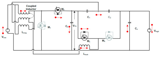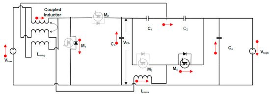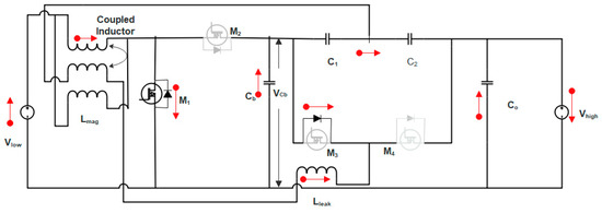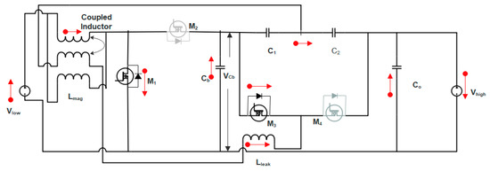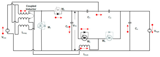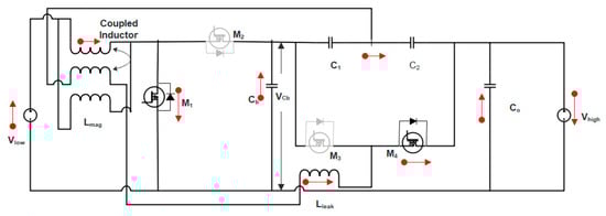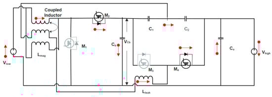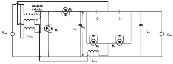 The circuit topology of the proposed converter comprises of a DC source input voltage Vs, the power MOSFET switches M1-M4, capacitors Cb, C1, and C2, and the coupled inductor with primary and secondary winding, Np and Ns respectively. The model of the coupled inductor bidirectional DC–DC converter also has a magnetizing inductor Lmag and a leakage inductor Lleak. The coupled inductor configuration provides high voltage gain and the reduced current ripple. The high conversion gain (boost mode) can be achieved by voltage doubler cell mechanism [14] based on the capacitor Cb. The proposed chopper circuit is shown in Figure 2.