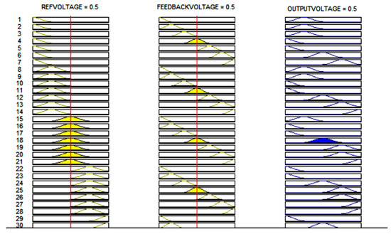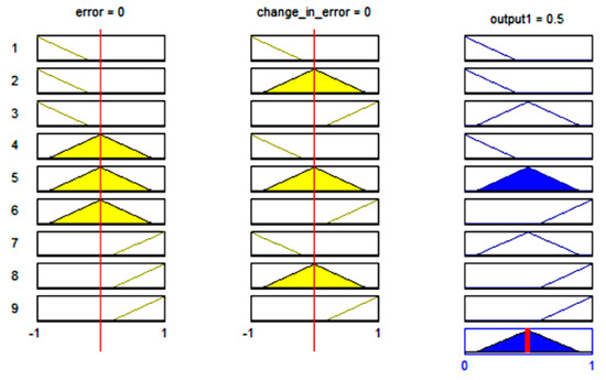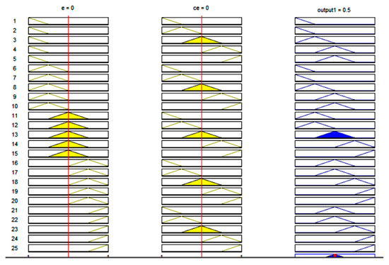 In the first rule, two input variables such as ‘error (e)’ and ‘change in error (ce)’ are taken along with an output variable ‘Output1’. Triangular membership function is used for all the variables in the given fuzzy set. For input 1 and input 2 (i.e.) error and change in error, the linguistic variables Negative (N), Zero (Z), and Positive (P) are assumed. For output, the variables are taken as Low (L), Medium (M) and High (H). The proposed rule is given in Table 3.