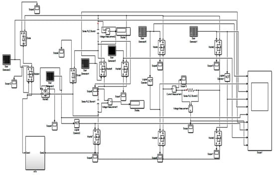 The proposed nine level inverter consists of two circuits, one is a developed SC circuit (DSCC) at the frontend of the inverter and another circuit is a conventional H-bridge circuit. The H-bridge circuit connected at the backend of the inverter is used for producing the negative voltage levels of the output [15,16,17]. The circuit configuration of multilevel inverter is shown in Figure 11.