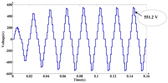 The nine level output voltage waveform for multilevel inverter interfaced with the PI controlled bidirectional dc/dc converter is shown in Figure 39.