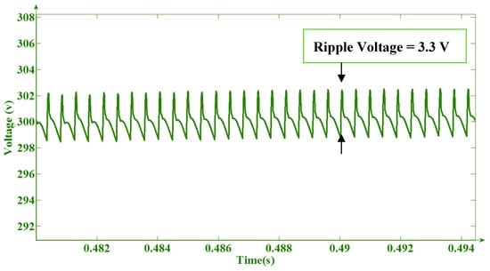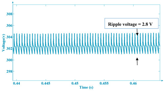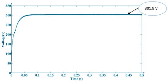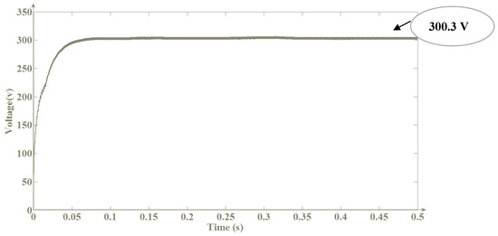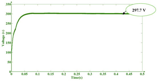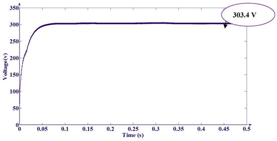 The output voltage waveform for bidirectional DC–DC converter with Hybrid controller-4 shown in Figure 46 provides an output voltage of 300.3 V.