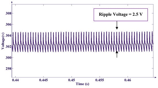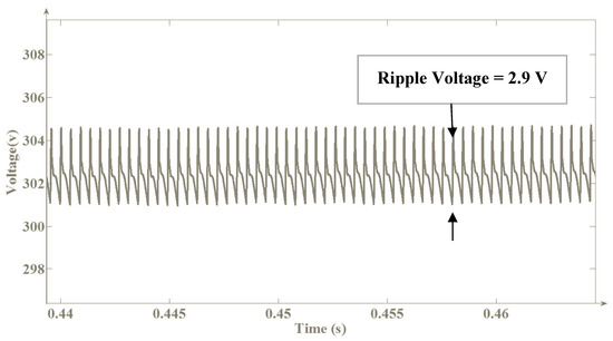 Figure 49 clearly depicts that this type gives a higher voltage of 303.4 V with very low ripple content. The ripple is calculated to be 2.5 V, which is very low when compared to the other proposed controller outputs. It is shown in Figure 50.