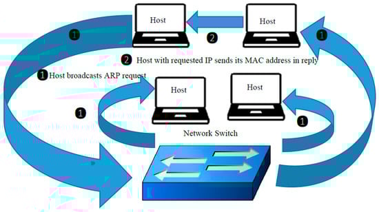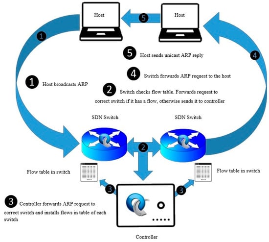 The destination host recognizes the IP address in the request, and sends a unicast packet to the host, thereby advising the host of its MAC address [8,9]. ARP handling in traditional networks is shown in Figure 1.