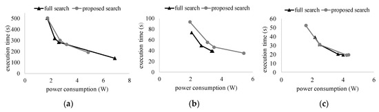 The proposed cost-based search and the full search schemes are compared for PARSEC, SPLASH-2, and VGG-F. Simulations are performed on four system configurations to compare the accuracy in various power constraints. In each configuration, the NMP and the host have the following operating clock frequencies of (200 MHz, 1 GHz), (400 MHz, 1 GHz), (400 MHz, 3 GHz), and (600 MHz, 4 GHz). In Figure 3, the horizontal axis represents the power consumption, whereas the vertical axis represents the execution time. The best offloading points are obtained in four configurations and the power-time values at that time are shown. Although the full search curve is slightly lower on the left side than the proposed curve, the two curves tend to be similar. Recall that the proposed and full search schemes need 2N and 2N computations, respectively, given N tasks. PARSEC, SPLASH-2, and VGG-F consists of nine, 10, and 11 tasks, respectively. In the full search scheme, 512, 1024, and 2048 computations are necessary for three applications, respectively. When the proposed scheme is used, the computational complexity is reduced by about 98%.