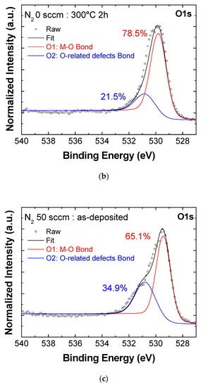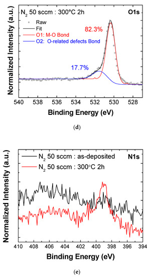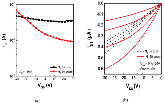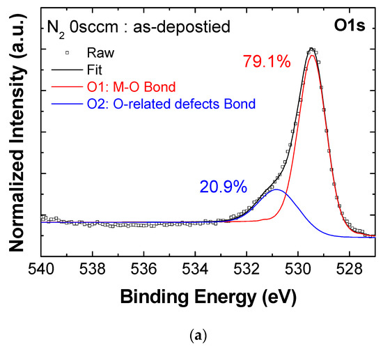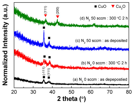 Candidate p-type oxide semiconductors include copper oxide (CuOx), tin oxide (SnOx), and nickel oxide (NiOx) [3,4,5,6,7]. Among them, copper oxide is a non-toxic, cost-effective material that may be deposited by various techniques such as sputtering, chemical vapor deposition, and even the sol–gel method [8,9,10,11]. As a transition metal, copper oxide may exhibit two different phases, namely cupric oxide (copper (II) oxide, CuO) and cuprous oxide (copper (I) oxide, Cu2O). The monoclinic CuO and cubic Cu2O have optical bandgap energy values around 1.9–2.1 eV and 2.1–2.6 eV, respectively [12,13]. Generally, most amorphous oxide semiconductors have significantly low hole mobility compared to electron mobility, because of the localized valence band (VB) states resulting from highly directional O 2p orbitals. However, copper oxide exhibits a quite different orbital configuration of the VB states. The Cu 3d and O 2p orbitals are located at nearly the same energy level near the valence band maximum (VBM), and are fully occupied by hybridization. Such a configuration forms less-localized VBM states, creating relatively fast pathways for hole carriers [14,15,16]. Charge transport in copper oxide occurs mainly via charged Cu vacancies, which generate acceptor levels near 0.3 eV above the VBM [17,18]. To obtain high-performance, copper oxide-based p-type thin-film transistors, the former studies generally reported on the effect of annealing temperature, oxygen flow ratio during growth, and external dopant concentration [19,20,21,22]. Especially, the incorporation of nitrogen was observed to improve the electrical properties of copper oxide, yet the exact mechanism was not elucidated.
