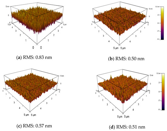 Atomic force microscope images of films grown with (a) N2 0 sccm, (b) N2 10 sccm, (c) N2 20 sccm, and (d) N2 50 sccm.