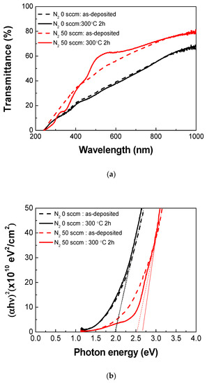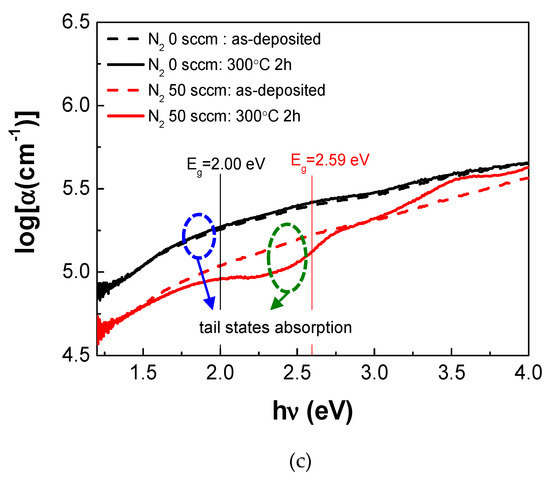 (a) Transmittance spectra of as-deposited and post-annealed films grown under N2 0 and 50 sccm, respectively. (b) Optical bandgap with respect to N2 flow rates using Tauc’s plot. (c) The tail state absorption with respect to N2 flow rates.
