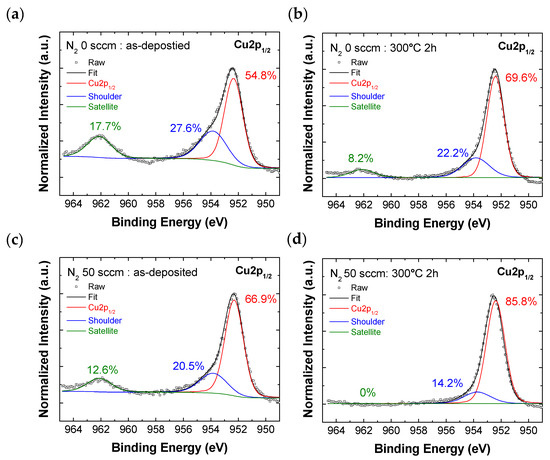 XPS analyses were performed to observe the chemical bond properties in the films. The peak positions were calibrated using the C 1s peak, of which the standard binding energy is about 284.5 eV. Figure 4 shows the Cu 2p1/2 spectra of annealed CuxO and CuON. Both as-deposited CuxO and CuON thin films exhibit shoulder peaks around 954 eV and satellite peaks near 962 eV. Such satellite and shoulder peaks originate from copper (II) oxide [22,23,24]. The intensities of the satellite and shoulder peaks in CuON decrease largely after annealing, which strongly suggests that some transition from monoclinic CuO to cubic Cu2O has occurred. Such results are also in agreement with the XRD results shown in Figure 1. Figure 5a–d shows the O 1s peak spectra of the CuxO and CuON films. The peaks were resolved into two sub-peaks from metal oxygen bonds (M–O) and oxygen-related defects bond such as oxygen deficient sites (VO) and contamination species (OH-). Generally, it is well-known that the M–O, oxygen-related defects peaks in metal oxides are located near 530.6 eV and 531.9 eV, respectively [19,25,26]. In CuxO films, the O 1s sub-peak spectra did not change much after annealing, which suggests that no transition has taken place. However, the addition of nitrogen results in an increased oxygen-related defects peak portion from 20.9% to 34.9%, as is observed in pristine CuxO and CuON, respectively. It suggests that nitrogen incorporation may disturb Cu–O bonds and increase disordering or O-related defect density. However, as the CuON layers are annealed, the oxygen-related defects peak portion decreases considerably from 34.9% to 17.7%. While the migration of nitrogen forming Cu–N bonds may have contributed to the decrease in the intensity of the oxygen-related defects, the transition from CuO to Cu2O is also a probable factor. Figure 5e shows the N 1s peak of the pristine and annealed CuON thin films. The peak at 398.08 eV indicates the presence of Cu–N bonds [20]. In contrast, Cu–N bonds are not detected in pristine CuON, which implies that the incorporated nitrogen atoms are most likely to exist in the form of weakly bonded interstitials.