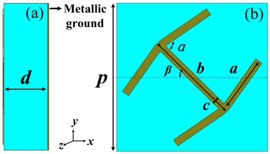 (a) Side view and (b) front view of the polarization conversion metasurface (PCM) unit.