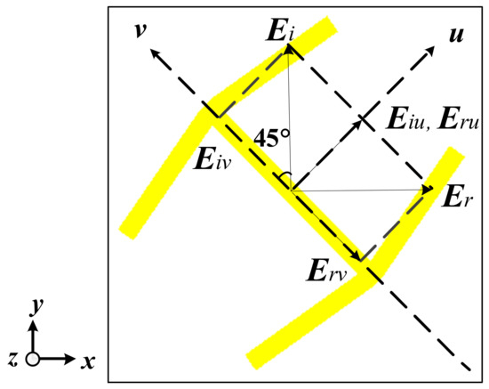 To better understand the response of the PCM, we consider that the incident plane wave is polarized along the y-axis. Thus, the electric field can be decomposed into two perpendicular components u and v, as seen in Figure 2. Hence, the electric field of the incident plane wave can be expressed as