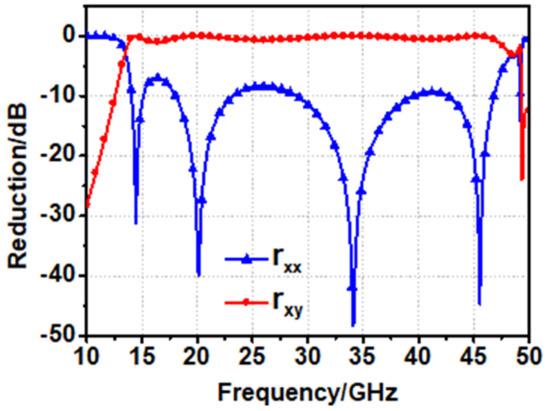 The cross-polarization rxy (ryx) and co-polarization rxx (ryy) of the unit under normal incident wave are shown in Figure 3. The cross-polarization reflection coefficients rxy (ryx) are close to 1 (0 dB) in UWB, which indicates that the polarization conversion can be realized under the normal incidence for both x- and y-polarization [24]. The UWB polarization conversion is resulted from its four resonant frequencies at 14.4 GHz, 20.1 GHz, 34.1 GHz and 45.5 GHz, and the polarization conversion efficiency is roughly 100% (see in Figure 3).