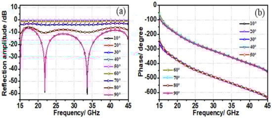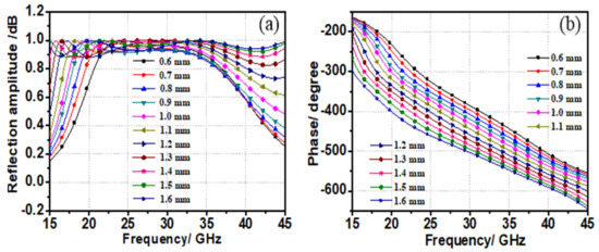 Figure 4 illustrates the amplitude and phase responses of the proposed structure with different lengths of a while β is fixed. As shown in Figure 4a, the amplitudes of cross-polarized reflections are greater than 0.9, as a increases, the linearity of phase is not affected and only the constant phase shifts can be observed from 15 GHz to 45 GHz. And as illustrated in Figure 4b, the range of phase shift covers over 180° in an UWB. In addition, when the value of a remains unchanged, the cross-polarized reflection coefficients with respect to different rotation angle β are shown in Figure 5. Obviously, by adjusting the rotation angle β, the amplitude of cross-polarization reflection coefficients can be continuously adjusted in a broadband (Figure 5a), while only a phase shift of 180° exists (Figure 5b).