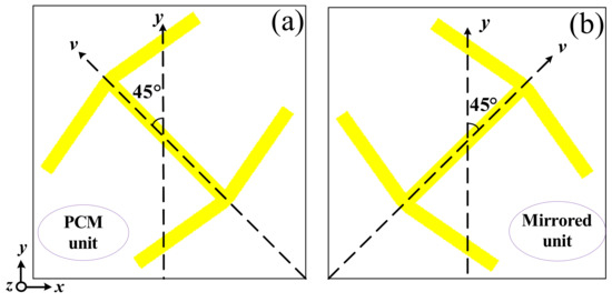 Schematic of x-to-y polarization conversion for (a) the PCM unit, and (b) mirrored unit.