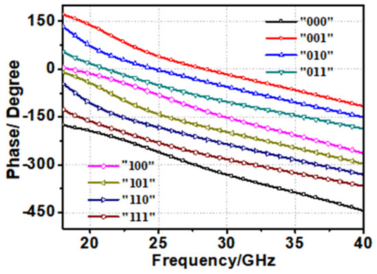 The design concept of this random coding metasurface is as follows: firstly, the PCM unit is proposed through optimum design and simulation. Secondly, the cross-polarization reflection phases at the center frequency (30 GHz) are selected as the design reference. Then, according to Cubic Spline Interpolation, the curves of cross-polarization reflection phase following the change of the length a are fitted by MATLAB [26]. Finally, the cross-polarized reflection phases are selected as 0, 1/4ᴨ, 2/8ᴨ, 3/8ᴨ, 2ᴨ, 5/8ᴨ, 3/4ᴨ and 7/8ᴨ, corresponding to the codes “000”, “001”, “010”, “011”, “100”, “101”, “110” and “111”, respectively.