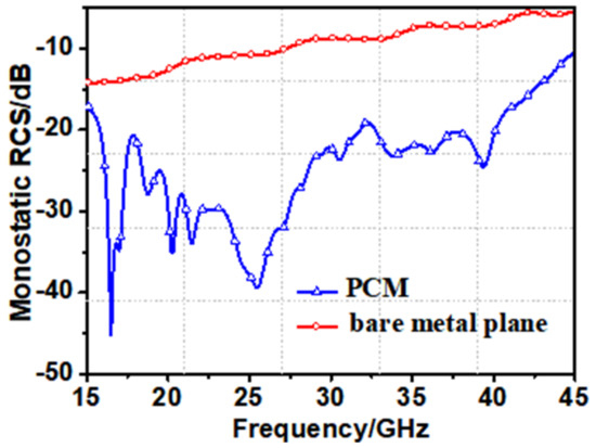 Figure 9 depicts the comparison of the monostatic RCS results between the proposed coding metasurface and a bare metal plane of the same sizes. It can be observed that, an UWB RCS reduction above 10 dB, ranging from 18.3–42.2 GHz, can be attained by the proposed coding PCM.