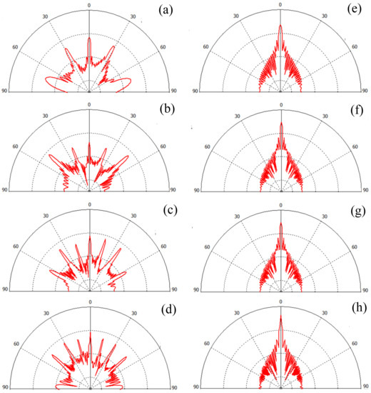 As shown in Figure 10, scattering patterns of the designed PCM (Figure 10a–d) and a bare metal plane of the same size (Figure 10e–h) in XOZ-plane are compared at four frequencies of 18 GHz, 25 GHz, 32 GHz and 40 GHz. According to the conservation law of energy, it is necessary to suppress the main lobe and strengthen side lobes for the metasurface to achieve RCS reduction [27]. It can be observed that a strong main lobe exists in the reverse direction of the metal surface in the entire working frequency band (as shown in Figure 10e–h), while the main lobes are reduced to some extent with the side lobes significantly increased in Figure 10a–d. Compared with the bare metal plane of the same size, the metasurface suppresses the main lobe energy and scatters the side lobes energy at 25 GHz and 40 GHz, which near the resonance points, as shown in Figure 9 and Figure 10b,d,f,h. While at 18 GHz and 32 GHz, the main lobe suppression are not obvious, which are consistent with the results in Figure 8.