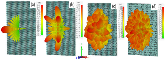 Figure 11a–d show the simulated far-field scattering patterns of random coding metasurfaces with different coding sequences at 20 GHz. In Figure 11d, it can be clearly observed that the main lobe reduces significantly and many side lobes are produced. Therefore, the proposed 3-bit metasurface with random coding and random rotation angle are more conducive to realizing RCS reduction, compared with the cases in Figure 11a–c, which are 1-bit 00/00 or 11/11 PCM structure, 1-bit chessboard structure, and 3-bit random coding metasurface without random rotation angle, respectively.