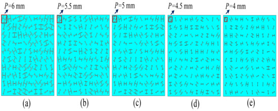 As shown in Figure 12, the RCS reduction changes when the length of period p varies from 4 mm to 6 mm, (see in Figure 13a–e) a wider bandwidth of RCS reduction can be achieved with a smaller period value. In a few words, when the unit size is the same, in a certain range, the shorter the period length is, that is, the denser the units are, the better RCS reduction effect of the metasurface basically can be realized.