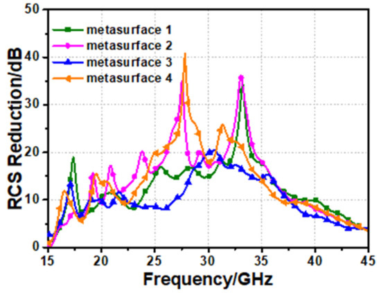 All the cases discussed above are analyzed with random coding order and random rotation angle with the fixed position of the units. In the following, the position of each unit is also randomized. As shown in Figure 14, four different random position distributions are given. Figure 14a indicates that each unit position is fixed and unchanged, while the randomness of the distance to the center for each unit is increased from Figure 14b to Figure 14d. The RCS reduction of the metasurfaces with four different random codings and random positions are shown in Figure 15, and it can be seen that the RCS reduction result is not the best when the location of each element is fixed (metasurface 1). Metasurface 2 and metasurface 4 both have wider RCS random bandwidths over 10 dB. While metasurface 3 is not better than metasurface 2 for improving RCS reduction effect. Therefore, it can be concluded that the RCS reduction can be also optimized by the appropriate randomness element position.