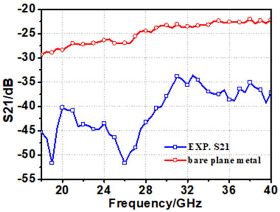 Comparisons of RCS between the proposed metasurface and a bare metal plate of the same sizes are shown in Figure 17. Compared with the bare metal plate of the same size, the proposed random 3-bit coding PCM can realize RCS reduction over 10 dB in an UWB ranging from 18.3–42.2 GHz. The comparison of RCS reduction measured by simulation and experiment are shown in Figure 18. The experimental results are in basically agreement with the simulation results, and a slight disparity between them can be explained by the uncertainty in the measure environment. In addition, the fluctuations which maybe attributed to: (1) an ideal plane wave is used in simulation while the plane wave used in the experiment is generated by the far-field radiation of the horn antennas; (2) the limited dynamic range of the vector network analyzer (VNA) at high frequencies and others.