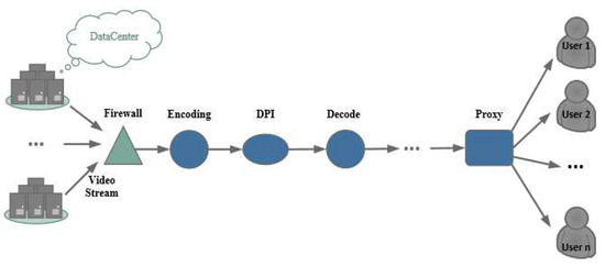 Once multiple users request the same service, repeated operations of VNF deployment and traffic transmission are created from the unicast, causing a waste of resources. This resource wastage can be reduced by using multicast technology. There are multiple destinations for multicast. It has an extensive and applicable future, and plays an important role in software updates and data monitoring [23,24,25]. The bandwidth consumption of the backbone network is reduced by more than 50% with multicast [26]. To ensure the security and performance of the propagation, multicast traffic often needs to pass through certain VNFs before arriving at all the destinations. By connecting these VNFs one after the other, a service function chain (SFC) is formed. We can view an SFC as a concrete implementation of a service request.