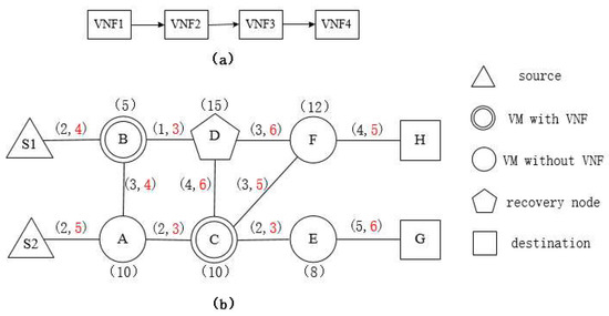 The considered network is modeled as an edge-weighted vertex-weighted directed graph , , where is the source set. represents the set of VM nodes that are real physical nodes and can run/host different kinds of VNFs. Each VM node has a limited computational capability and can be hosted on a server. , where is the set of recovery nodes and is the set of switch nodes. Recovery nodes are a kind of VM nodes that have storing function except for VNF implementation. Recovery node can store packets. It can re-transmit the packet when packets are lost. Re-transmitting from recovery node instead of source node reduces the transmission cost because recovery nodes are always closer to the destination than the source node. A switch without computational capability can only forward the traffic. is the set of destination nodes requesting the same services, and, as shown in Figure 2, there are 10 nodes. , , , , . Nodes have run the VNF2 and VNF3, respectively, and node D is a recovery node.