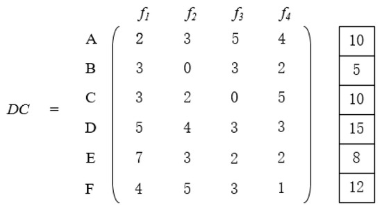 There is a set of VNFs F, and an SFC that is composed of some VNFs from F. Each VNF f running on VM m requires a certain computational resource . All the computational resource requirements can be represented by a matrix, as shown in Figure 3. The row represents the VNF, and the column represents the VM. The element in the fth row and the mth column is the computational resource of VNF f running on VM m. The elements in the 2nd row and 2nd column, and the 3th row and 2nd column are both zeros, as a result of nodes B and E having run the VNF2 and VNF3. Therefore, the computational resource is zero and each column from the matrix represents the available computation resource of the nodes. We assume that each VM m supports all the VNFs in F and can run more than one VNF. Additionally, is the upper bound threshold of delay that the user can wait for.
