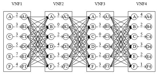 Figure 5 is the MOD network transformed from Figure 2. In Figure 5, the values on the dotted arrow equal the matrix in Figure 3. The values on horizontal solid arrows are zero, such as and , and this means that the two VNF are running on the same VM, and there is no bandwidth consumption. The value on the non-horizontal solid arrow equals the shortest path bandwidth cost between two nodes in G, such as .
