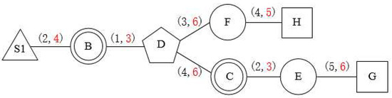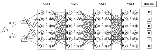 Then, we search for the shortest path from virtual source to the last model and satisfy the resource constraints. As shown in Figure 6, the shortest path from the virtual source to the last model found by the improved Dijkstra algorithm [42,43,44,45] is , which is in the network G. Node B deploys VNF1 and VNF2, and node D deploys VNF3 and VNF4. VNF2 is running on node B; therefore, only VNF1 is deployed in node B.