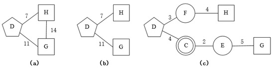 All the VNFs run on the VM nodes on the path found in the first phase. The next step is to construct a tree to connect the last VNF’s location and all destination nodes with minimum cost. The last VNF’s location is always on the last model in the MOD network based on the first phase, and it is a Steiner tree problem, which is NP-hard. According to [32], we used an approximation algorithm to solve it, as shown in Algorithm 2. For example, we assume that node D is the last VNF’s location, and, therefore, the Steiner tree should contain the nodes , and G, as shown in Figure 7. Firstly, the nodes , and G are selected to construct a complete graph, as shown in Figure 7a. The link’s weight is the shortest path length between nodes in the original network G. Secondly, the minimal spanning tree of the complete graph network can be found by Prim algorithm. Finally, every link in the minimal spanning tree is replaced by the shortest path in the original graph G, and a minimal cost tree is constructed as shown in Figure 7c. Combining the shortest path from the first phase and the tree from the second phase, we can construct a multicast tree from the virtual source node to all the destination nodes. Figure 8 is the multicast tree of Figure 7.