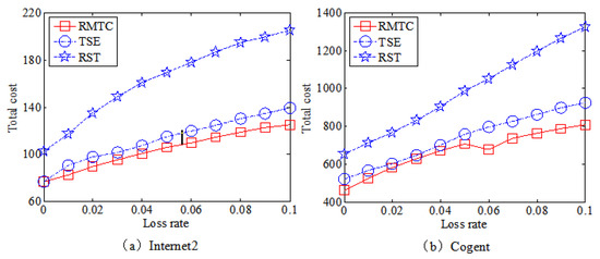 The loss rate varies from 0 to 0.1. The total cost for the multicast tree construction increases as the loss rate increases in both the network topologies, as shown in Figure 10. When the loss rate is zero, then the costs of RMTC and TSE are equal, and no packet loss will mean there is no recovery cost. RMTC and TSE use the same method in the multicast tree construction phase. Therefore, the costs of RMTC and TSE are the same.