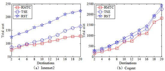 Figure 11 shows that the total cost increases as the number of destination increases before achieving the optimal cost for different topologies. The number of destinations grow from 2 to 20 at intervals of 2. Specifically, Figure 11a reveals that the increasing trend of RMTC and TSE are slow in Internet2 network. The number of destination nodes does not make a big difference for both RMTC and TSE, due to the fact that the range of route tree constructed by RMTC and TSE is wide. When adding or removing some nodes, the backbone of the route tree remains. For the cross-domain Cogent network, it is not easy to find a route tree to cover all destinations because of the large scale. Therefore, the increasing trend of the three schemes are similar in the Cogent network.