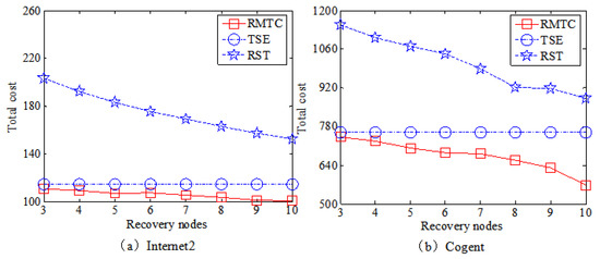 In this subsection, the number of the recovery node is set from 3 to 10. Figure 12 illuminates that the line of TSE is horizontal, meaning that the total cost of TSE has no business relation to the number of recovery node. The re-route of TSE is only from the source nodes and, as the number of recovery nodes increase, the total costs of the other two schemes decline. When there are more recovery nodes, there are more available choices for the re-route 362 node and the total cost becomes low.