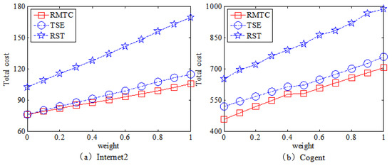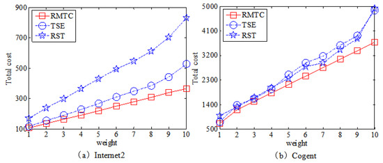 Figure 14 shows the total cost as weight grows from 1 to 10. The trend of total cost is similar in the two different topologies and the high recovery cost results in the rapid growth of the total cost in RST.