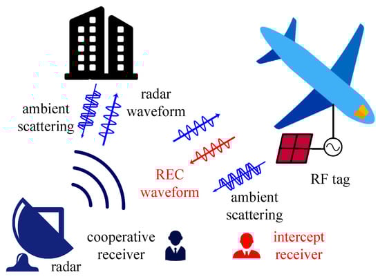 As shown in Figure 1, the operational concept of REC consists of four primary aspects. Firstly, an area is illuminated by radar, which may be friend or foe. Secondly, the radio frequency (RF) tag/transponder processes the received signal and embeds communication signal into radar signal of the same time and the same frequency to cover up the communication signal with the radar signal. Thirdly, the cooperative receiver detects and recovers the covert information transmitted by the RF tag. Finally, there may be an intercept receiver.