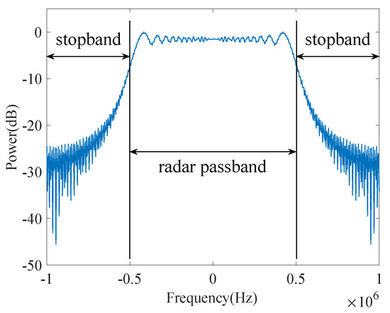 The spectrum of LFM radar waveform is shown in Figure 3. We can see that most of the spectral components are distributed in the passband, while only a small amount of the spectral components are distributed in the stopband. Corresponding to the matrix , we can use the eigenvectors and eigenvalues to characterize . The larger the eigenvalue, the more information the corresponding eigenvector can be carried, and the higher the similarity with the radar waveform would be, vice versa.