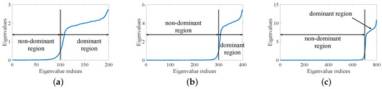 Figure 4 shows the eigenvalues of LFM radar signal at oversampling factors of , and respectively. N equals to 100. Since the eigenvalues are arranged in the order of increasing magnitude, we can define the last L eigenvalues as the dominant region and the remaining eigenvalues as the non-dominant region. Similarly, we can define the eigenvectors corresponding to the dominant region as dominant eigenvectors and the eigenvectors corresponding to the non-dominant region as non-dominant eigenvectors. The size of the dominant region is L (the value of L is variable, which could further improve the LPI performance. For convenience, we take L equal to N.), which is determined by RF tag and radar. L satisfies and . Therefore, we can further express Equation (6) as follows [28]: