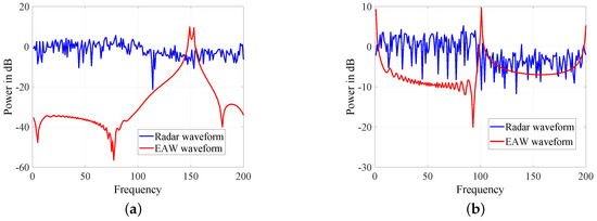 Comparison of the low probability of intercept (LPI) performance. (a) SIR = −25 dB, signal-to-noise ratio (SNR) = −5 dB (b) SIR = −35 dB, SNR = −5 dB.