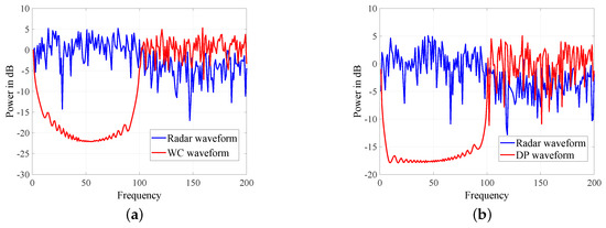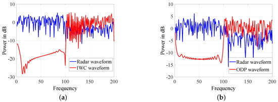 In Figure 6, Figure 7 and Figure 8, we check the spectrums of five strategies. As shown in Figure 6, EAW has explicit peaks in the spectrum, and thus it is not covert. As a result, we will no longer consider it in other simulations. WC, DP, CWC, IWC and ODP do not have obvious peaks and are similar to the radar waveform in the stopband. CWC is a special case of WC, and the spectrum of CWC is similar to that of WC as Figure 7a. Besides, as shown in Figure 7b and Figure 8b, the spectrums of DP and ODP are similar. Since only a part of non-dominant eigenvectors are selected, the difference between IWC and radar waveform is greater than that of ODP and radar waveform. However, we can see from Figure 8a that IWC is still under the mask of radar waveform. These simulations have shown that WC, DP, CWC, IWC and ODP all possess the LPD performance.