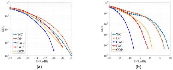 Figure 9 shows the reliability comparison between the traditional strategies and the proposed. We consider the typical IWC waveforms mentioned in Equations (24) and (25) as an example. A DLD receiver is used, and the SIR is set to −25 dB and −30 dB. When SIR is −25 dB, CWC outperforms WC with 3.5 dB at SER of while IWC outperforms WC with 1.5dB. This trend is more pronounced when SIR is decreased. In the SIR of −30 dB, CWC outperforms WC with 16 dB at SER of while IWC outperforms WC with 10 dB. ODP also remarkably improves reliability on the basis of DP. At SIR −25 dB, ODP outperforms DP with 1.5 dB at SER of . In the SIR of −30 dB, ODP outperforms DP with 6 dB at SER of .