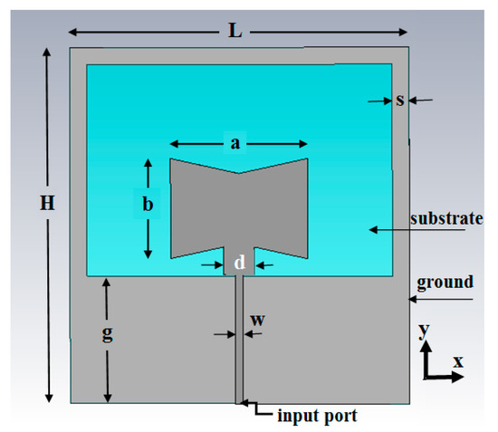 The final layout of the synthesized antenna, Antenna_1, is depicted in Figure 2. It includes the bowtie patch which is printed, via copper, on dielectric substrate FR4, with εr = 4.4, thickness h = 1.6 mm and loss tangent considered to be ~0.015 in the entire frequency band of calculations, taking into account that the thickness of the copper ground layer and of the bowtie patch is 0.07 mm the entire thickness of the antenna is 1.74 mm. The patch is fed by microstrip line with characteristic impedance 50 Ω through a wider line of width d, for matching purpose. The antenna’s geometrical parameter values are included in Table 1.