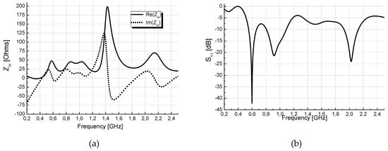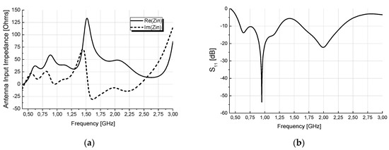 Antenna_1: (a) real and imaginary part of the antenna’s input impedance, (b) scattering coefficient of the feeding signal at the input of the antenna.